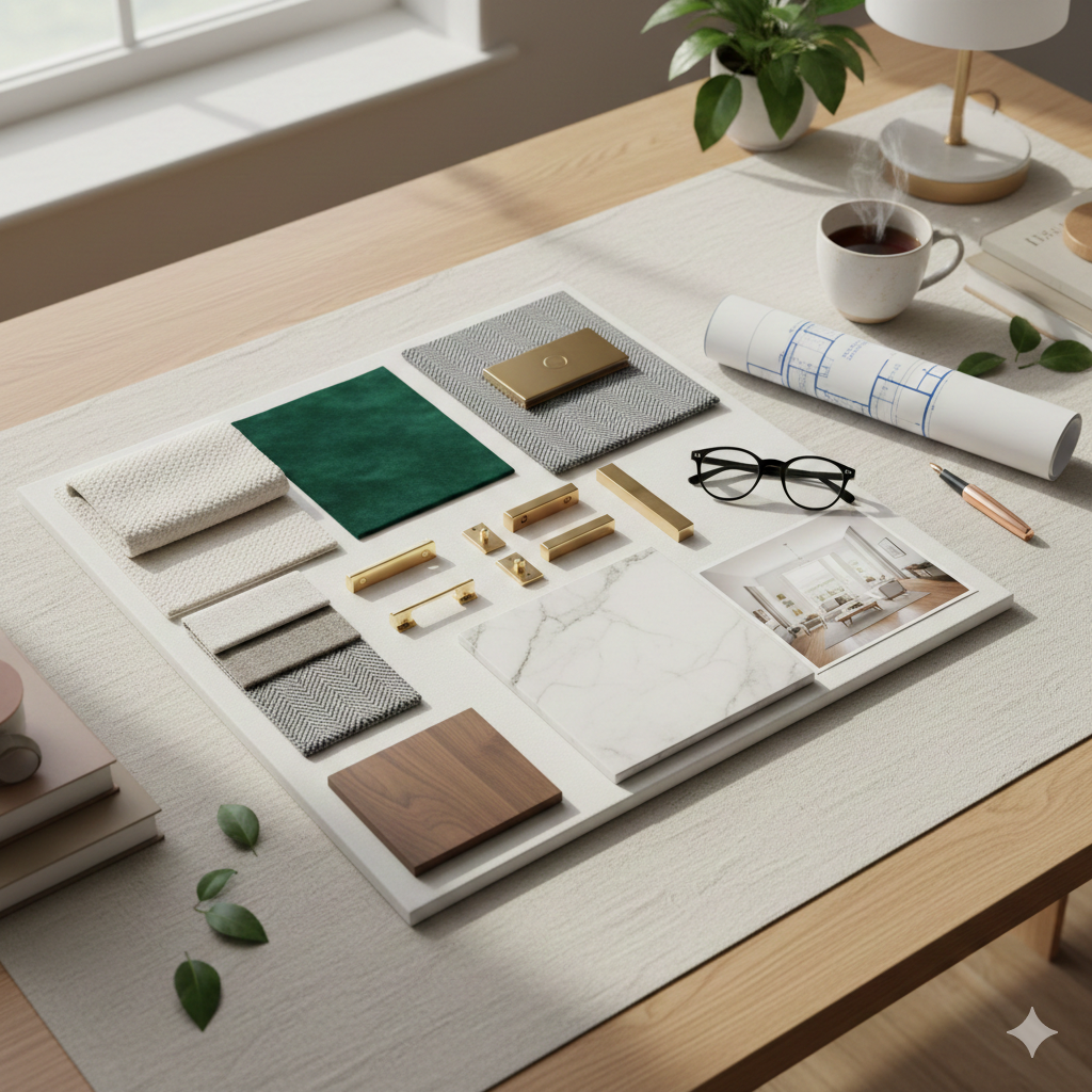 Mood boards, material palettes, and design narratives shape the creative direction.