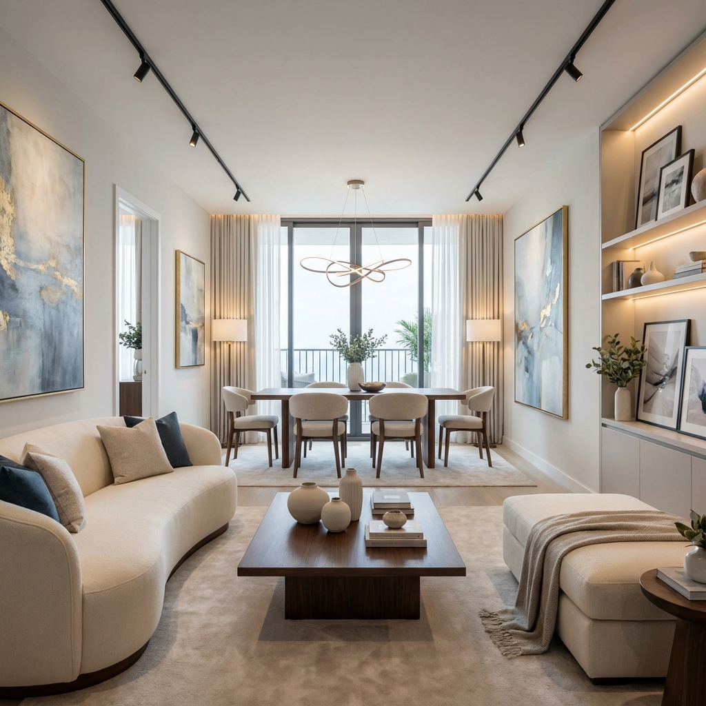 Complete end-to-end services including furniture, lighting, materials, and installation
